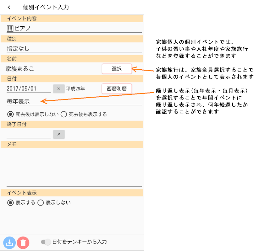 我們會通知您家人、親戚和朋友的重要日子!顯示年齡從生日,小學,初中和高中大學畢業,長壽慶典,結婚紀念日,逝世紀念日和周年紀念日,追悼會(法律事務)