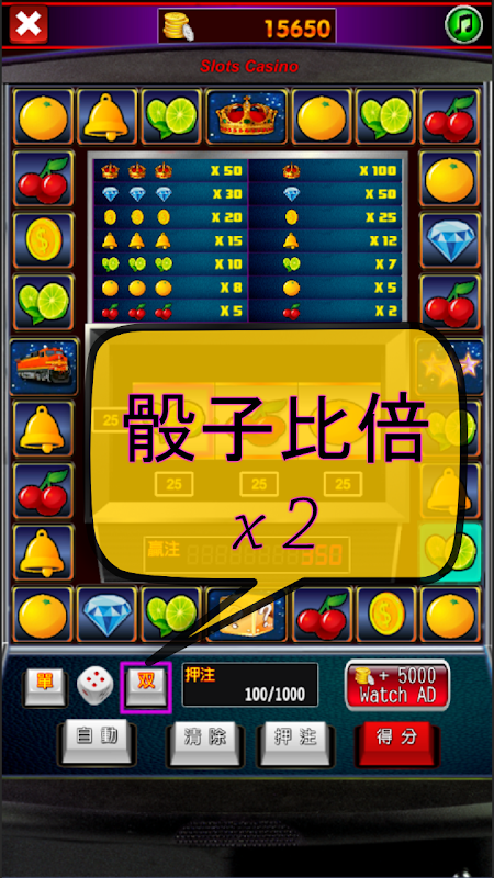 玩家可依喜好進行押注,初始以100/1注,最高可押10注,