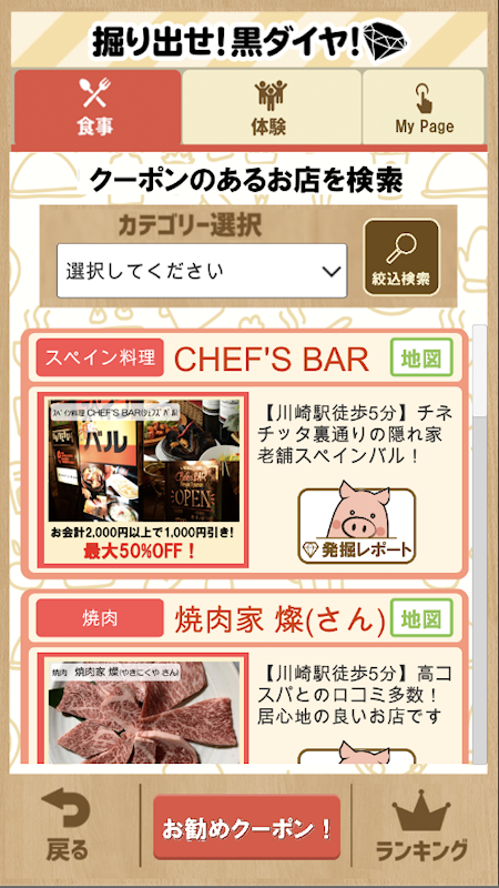 川崎駅徒歩圏内のクーポンアプリ【掘りだせ!黒ダイヤ!】 1.1.0