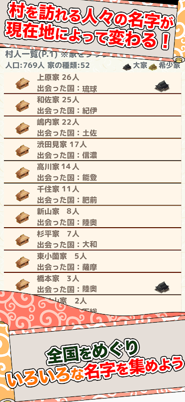 這是一款歷史遊戲,任何人,無論你是否對姓氏感興趣,都可以建立一個以你的姓氏命名的村莊並統一日本。在排行榜中,你可以與日本乃至全球最強的村莊一較高下,看看他們如何發展。如今,家庭變得越來越小,所以讓我們體驗一下收割稻米、擴大家庭和發展村莊的真正快感吧。這是一款以平安時代為背景的《收割村訓練模擬應用程式》,誕生於熱門遊戲《戰國村》。
