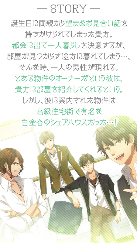 それは,甘く切ない戀の始まり-。 白金台のオシャレなシェアハウスで,年齢も職業も違う個性豊かな住人たちとの新しい生活が始まる-。