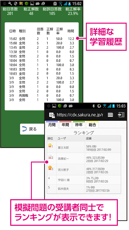 同じアプリ使用者の間でランキングを表示できます。上位ランキングを目指して繰り返し学習しましょう。"