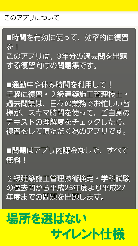 手軽に復習・2級建築施工管理技士・過去問集は、日々の業務でお忙しい皆様が、スキマ時間を使って、ご自身のテキストの理解度をチェックしたり、復習をして頂ただく為のアプリです。