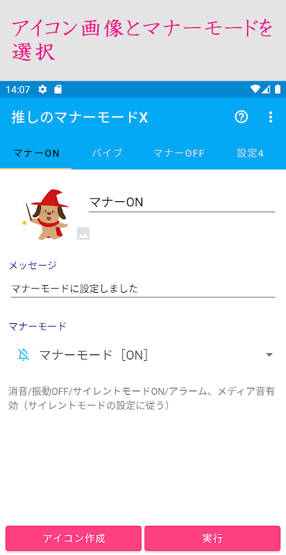 從任何圖像創建圖標。點擊主屏幕上的圖標以設置靜音模式。