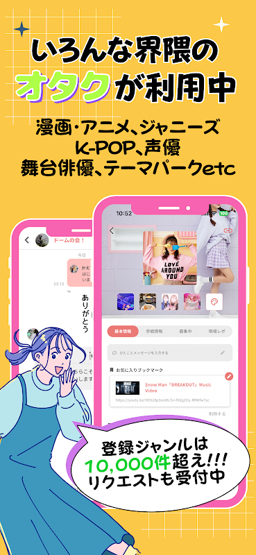 認識熱愛偶像和禦宅族活動的朋友!女性專屬應用,幫助您找到志同道合的偶像、女性朋友和禦宅族朋友!也可用於陪伴、探險和物品交換 | 18歲以上,免費註冊,值得信賴的支持
