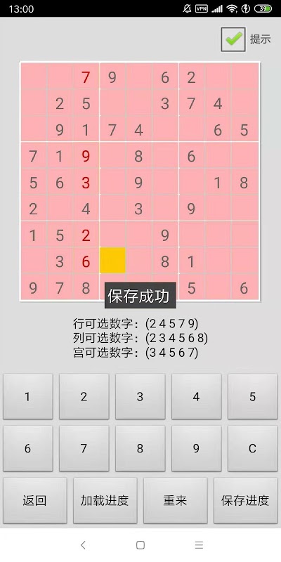 三個難度,具有提示及保存進度功能的數獨遊戲。
