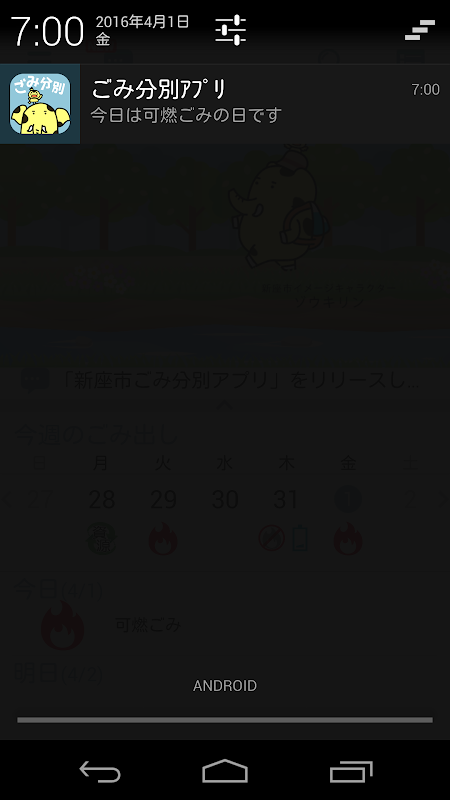 収集予定のごみ種別を前日と当日にアラートでお知らせします。時間は自由に設定することができます。