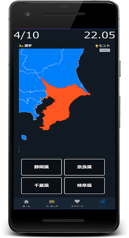 日本地圖縣名測驗是一款類似遊戲的測驗應用程序,可讓您根據縣在地圖上的位置使用 4 個選項來回答縣名。