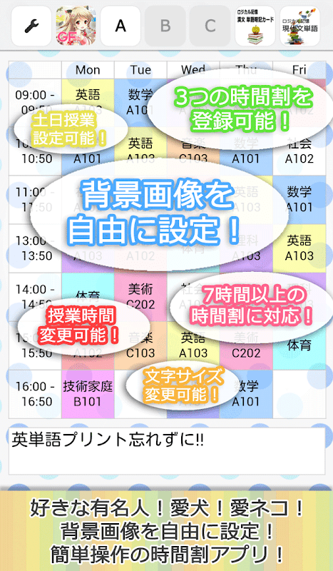 背景画像の設定が自由なので、シンプルな時間割からポップでかわいい時間割まで、様々な時間割を作成可能です。