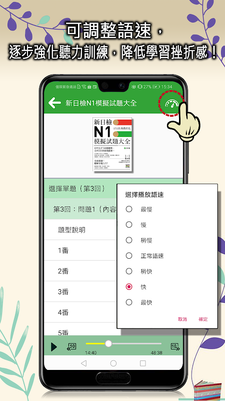 ●自由設定6段語速(慢、稍慢、正常語速、快、較快、最快)便於「訓練聽力」。