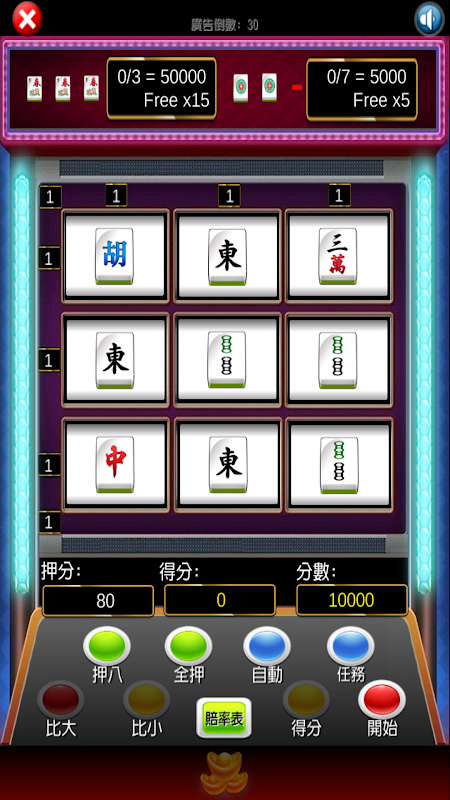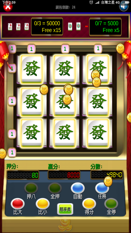 免網路! 免花錢! 大獎連連!擬真機台設計讓您享受真實的水果機台遊戲,結合麻將新元素讓您體驗以小博大的刺激感!