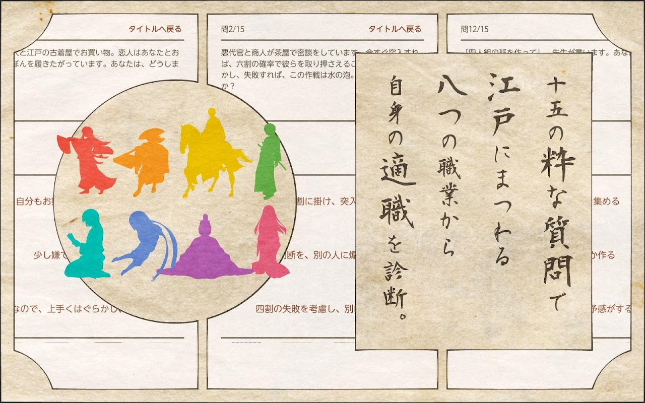 通過對15個問題的簡單心理測驗,該診斷可以計算出您在江戶時代適合的工作。它還具有兼容性診斷功能,列出了可以在那個時代為您提供幫助的作業。也許那個人也會在現代社會中為您提供幫助。您為什麼不要求您的朋友去做並找到一個好伴侶?
