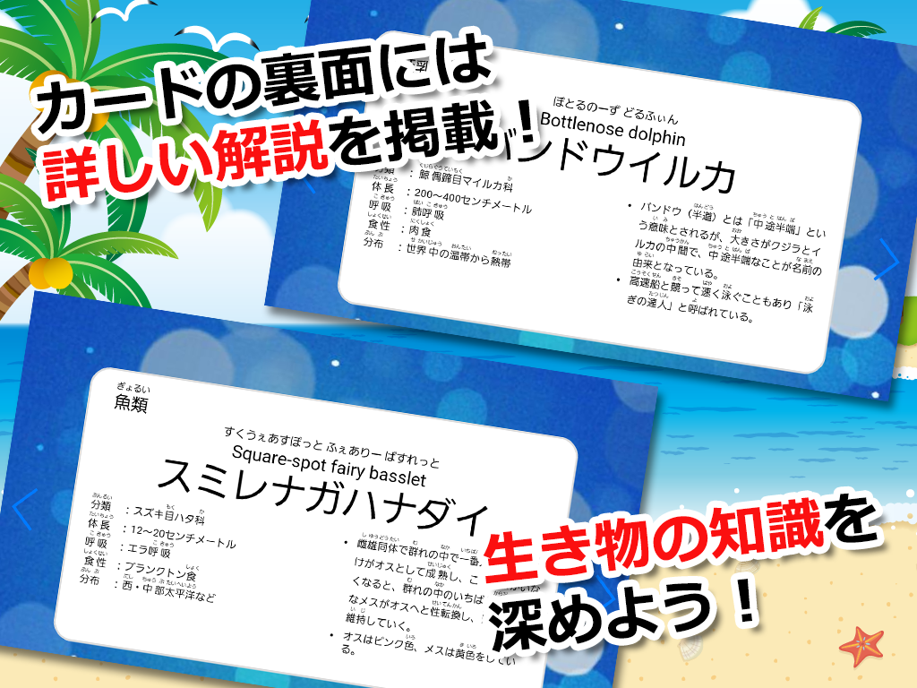 在水族館滿足大型組不同尋常的生物已經成為卡!因為隨著朗讀日語和英語的功能,將盡快記住作為名字!你可以發揮你的重複的測驗。