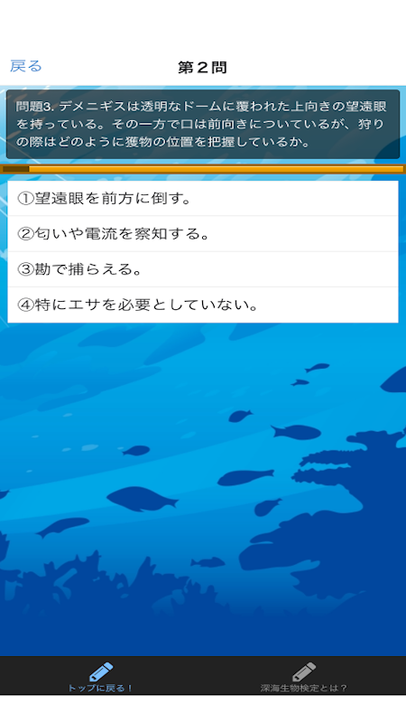 深海生物検定を手軽に4択、もしくはマルバツのクイズ形式で勉強することができます。難易度は意外と高いので、2級・3級、ともにカバーすることができます。