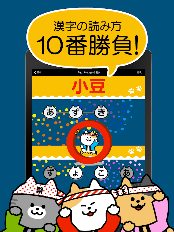 50音チャレンジの他、画数の多い漢字、有名人の名前、魚へんの漢字、戦国武将、体のツボなど、多彩なジャンルの漢字の読み方クイズに挑戦しよう!