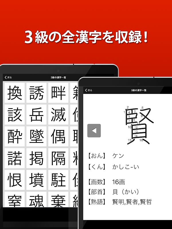 Ultimate Kanken 3級問題收集應用程序!嘗試閱讀,寫作,部首,假名,同義詞,同義詞,同名變體,錯字校正,四字符成語和成語。