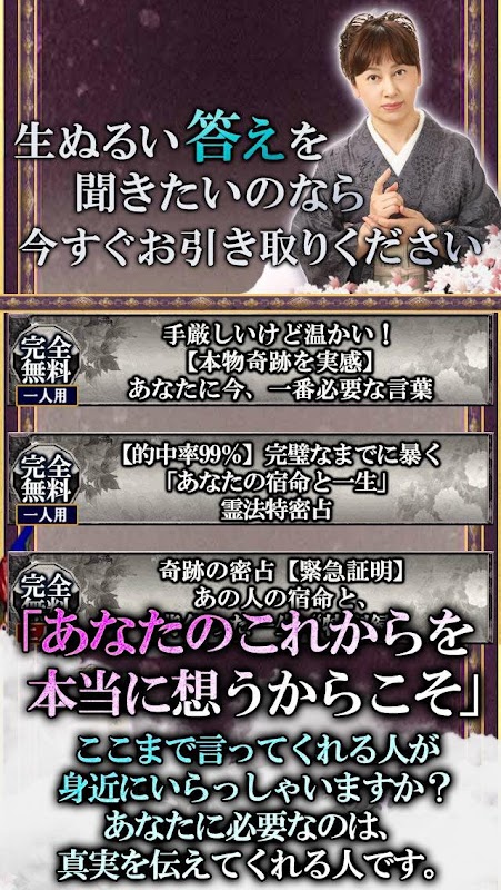 “この人だけは本物です”予約が取れないと噂の占い師「祈祷師 菜奈実」本格活動から二十年、手厳しいけど温かい。その的中力と、真心こもった肉親レベルの温かく包み込むような言葉によって幅広い層のリピーターに支持され、いまや予約が取れないと口コミの鑑定がアプリで登場しました。有名女優や、大物実業家も彼女のアドバイスに涙を流す。本物の鑑定をご用意しました。