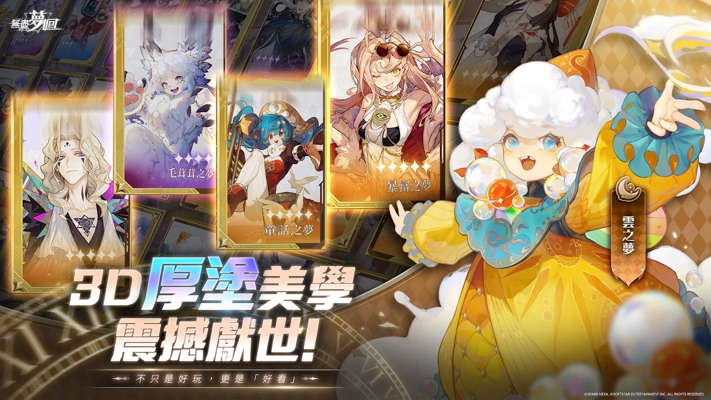 以3D厚塗重新詮釋夢境美學,無論角色立繪還是戰場場景都細膩入魂。每位夢靈角色皆由專業繪師手創細琢,充滿個性與風格。夢境世界如幻如真,呈現出濃烈又溫柔的視覺張力,打造出獨一無二的沉浸氛圍。