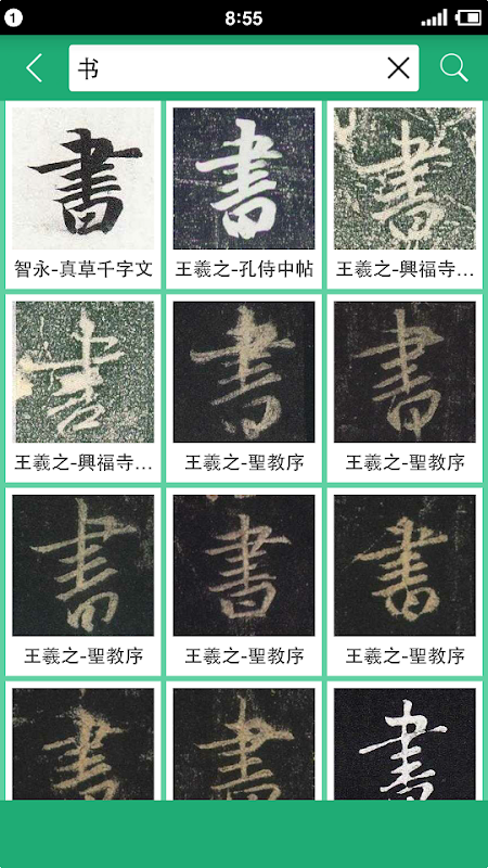 收錄王羲之,王獻之諸帖,對於二王一脈的其他著名書家也有收錄,如智永真草千字文,孫過庭書譜等。圖片萬餘張,不重複單字近兩千個,基本涵蓋常用漢字。詳情如下: