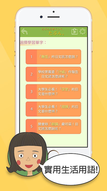 APP內收集【Too idiots / 兩個傻瓜】高人氣的單字教學,讓你瞭解接地氣的日語用法,學習多種課本學不到的單字,並藉由對話的方式呈現,更清楚使用時機與含意。