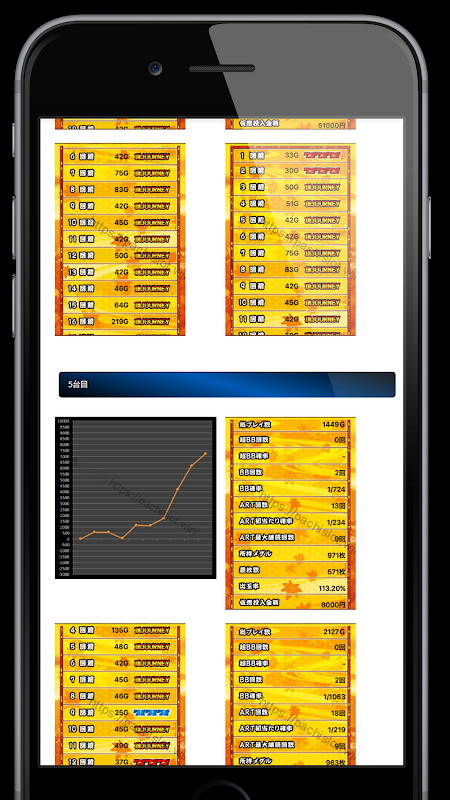 ・番長3の各設定ごとにシミュレートしたスランプグラフや差枚数のデータを、ウェブサイト経由で見ることが出来ます。