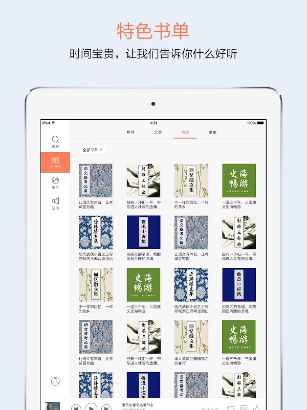 專業演播精心錄制,百聽擁有艾寶良、臧汝德、馬長輝等相聲評書大師,李野墨、梁皓明、盧吉雄等名家主持主播、配音演員精心錄制的優質有聲書,有聲世界,先聲奪人!