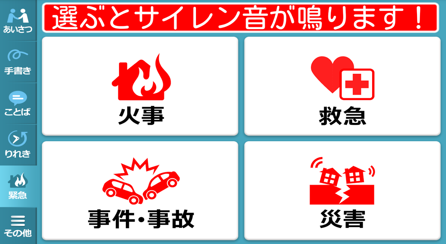 聴覚に障がいのあるかたは、2011年3月の東日本大震災の際に、自分の身の回りで起きている状況を把握できずに困ったそうです。声を出すことも難しいので、家の中に閉じ込められた時などに端末の最大音量でサイレン音を鳴らして第三者に助けを求められるようにしました。