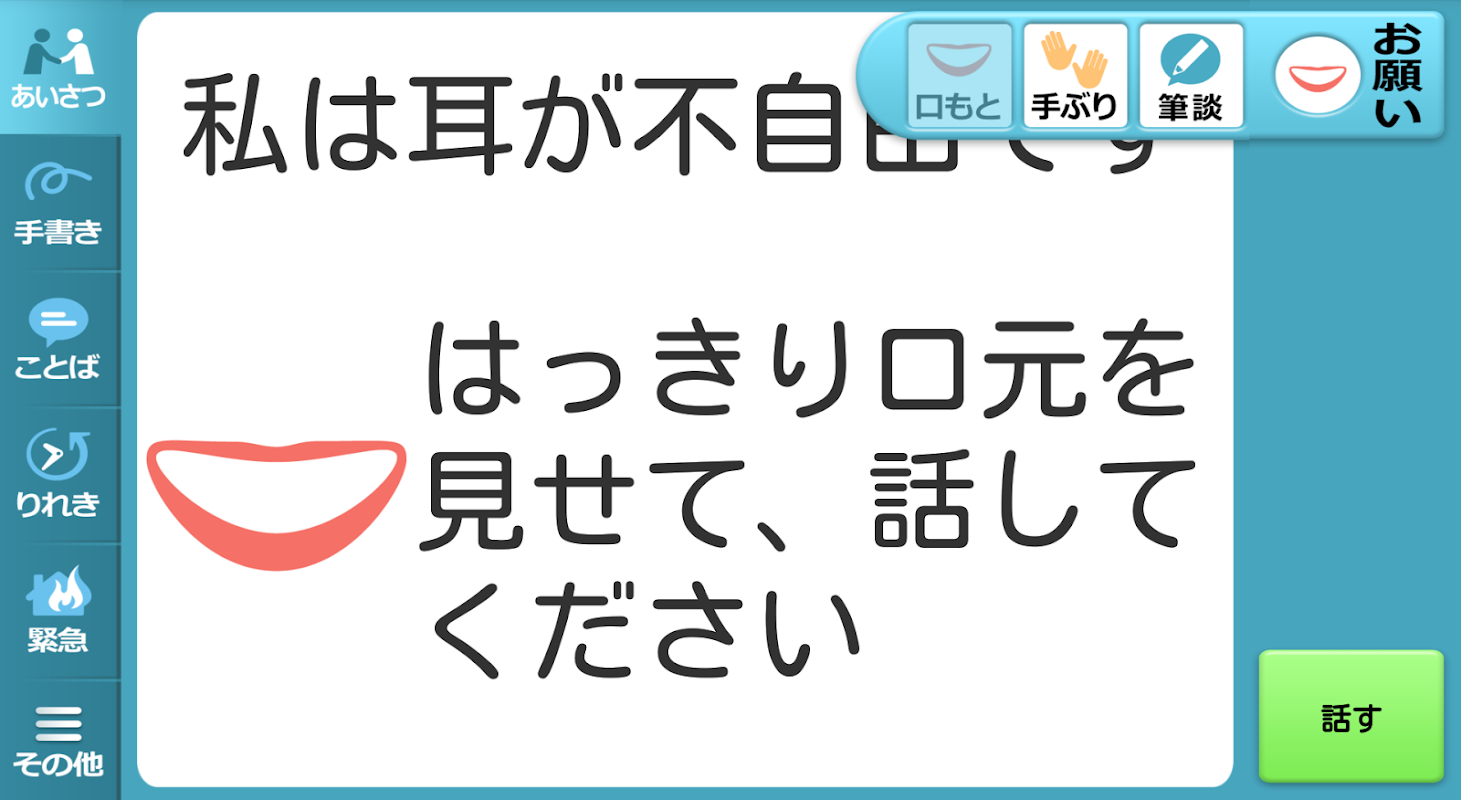 従来の筆談アプリには、自分の耳が不自由であることやお願いしたいことを聴者(耳の聞こえるかた)に伝える手段を備えていないことが分かったため、あいさつ画面を用意してそれらを伝えられるようにしました。