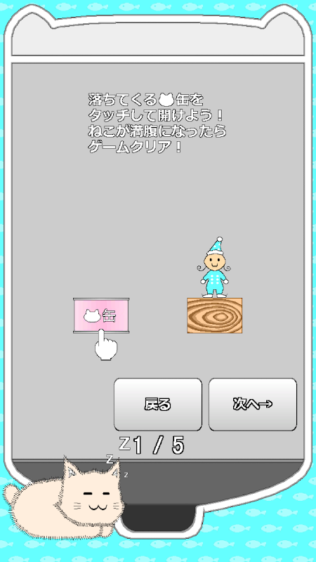 上から降ってくる缶やねずみをタッチして、餌に変えてあげましょう。