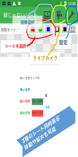 赤、緑、青、3色の色付きセロファンシートが同時に使えます。