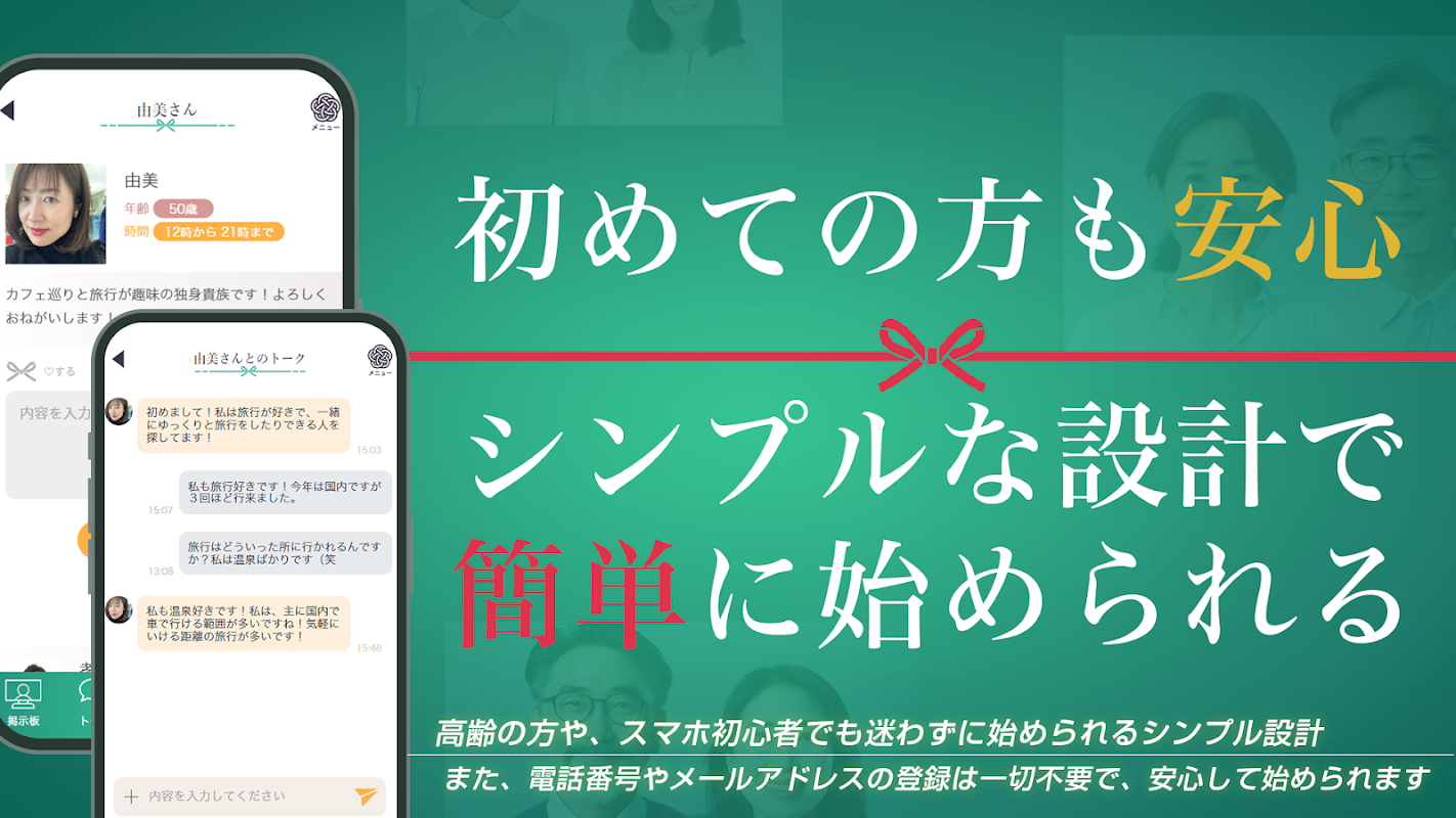 Enkatsu Lovers is an exchange matching app where middle-aged, middle-aged and senior generations in their 30s to 60s and 70s and above gather. Simple and easy-to-use functions make it easy for even first-time users to find a partner