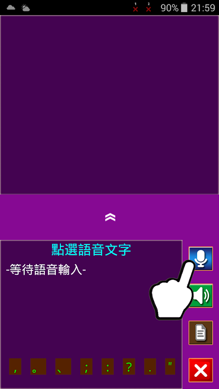 *按下Mic鈕後輸入語音,辨識轉換成文字後會於下方欄顯示多列文字供使用者選擇,使用者選擇其一,上方欄的會將選擇文字填入,上方欄可用鍵盤修飾文字。