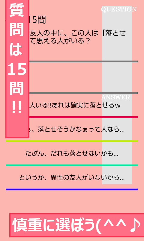 このアプリはランダムに出題される15問の心理テストに答えるだけで、その人の肉食女子度を測定しちゃおうという、まぁ、ありそうで、なさそうな、いや、あるかな?まぁ、そんな診断ゲームアプリとなっております。