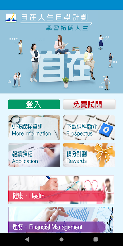 「自在人生自學計劃」課程範疇圍繞健康、理財、人際關係、藝術文化和生活,供有興趣人士報讀。開課後,只需登入本應用程式,即可閱覽已選修科目的教材及相關資訊。