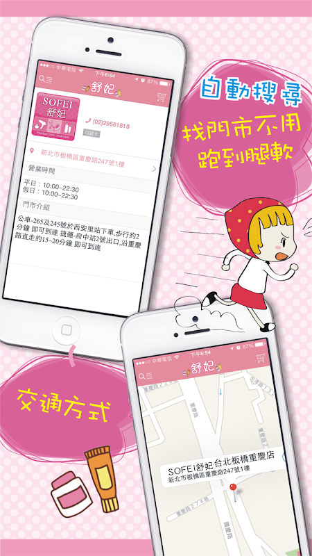 上網打關鍵字,點進官網再選門市資訊,找個實體店面三點四選的,你不累嗎?現在起不用了,舒妃APP擁有門市收尋功能,可自動找出離你最近的門市,購買喜愛商品不用再跑東跑西跑到腿軟囉!