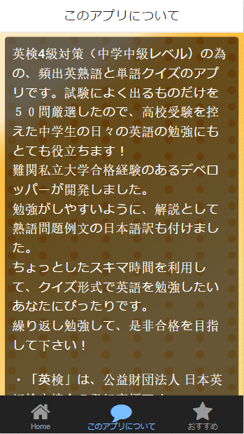 英検4級対策(中学中級レベル)の為の、頻出英熟語と単語クイズのアプリです。