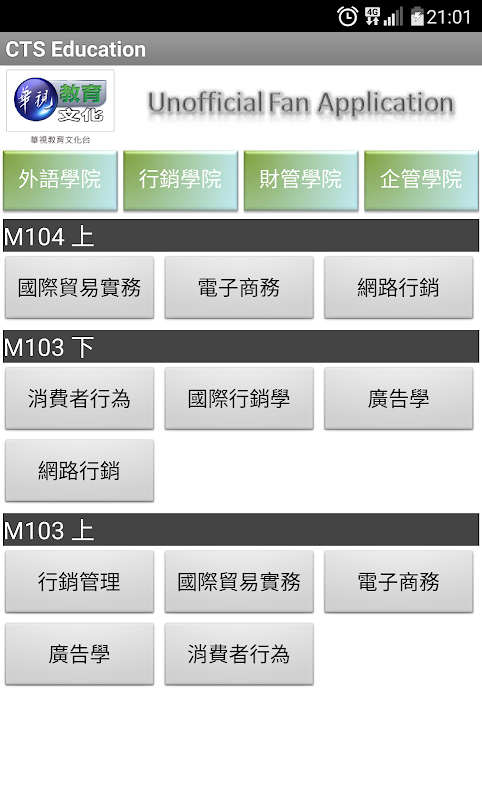 一個喜歡華視教育台的人,將華視教育頻道免費資源整合的應用程式。內容初分為外語學院、行銷學院、財管學院、企管學院。