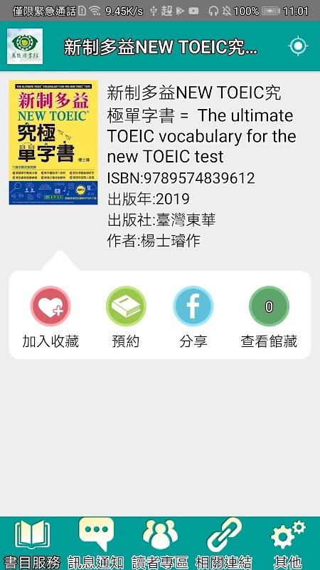 「萬能圖書館」為所有讀者提供便利的知識管道,可查詢萬能圖書館豐富的圖書資源與館藏,並且讓您更精確掌握知識動向。此外,讀者更可透過此軟體進行個人化服務,如接收預約到館通知、預約服務、通閱服務等。眾多令人驚豔的功能項目等您親自體驗。