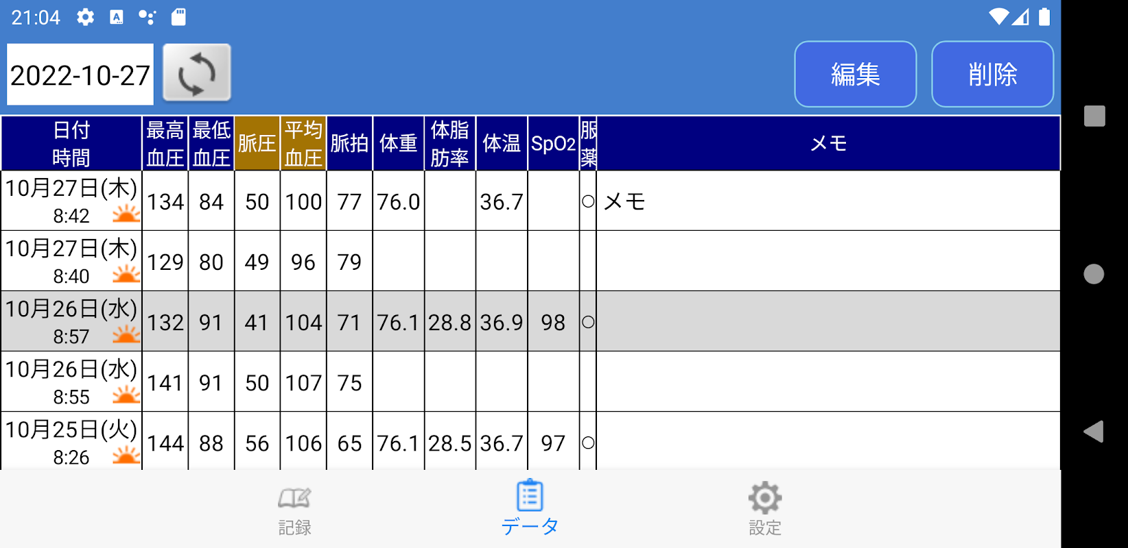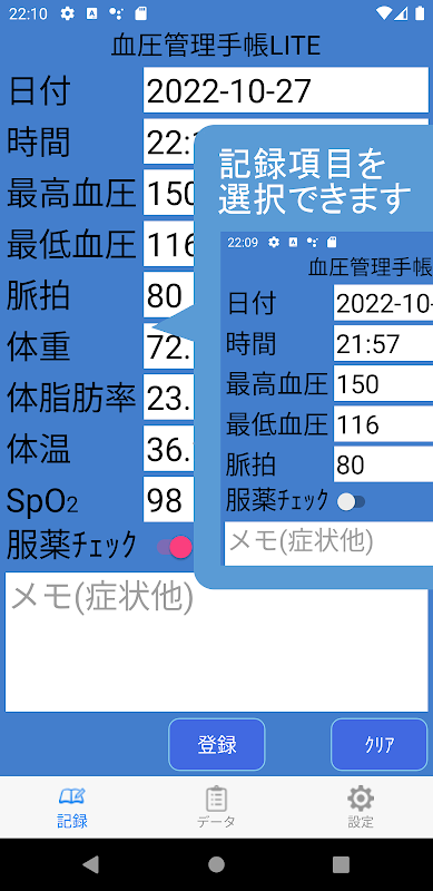 - 可選擇記錄項目(收縮壓、舒張壓、脈搏、體重、體脂率、體溫、SpO2、用藥檢查、備忘錄)。