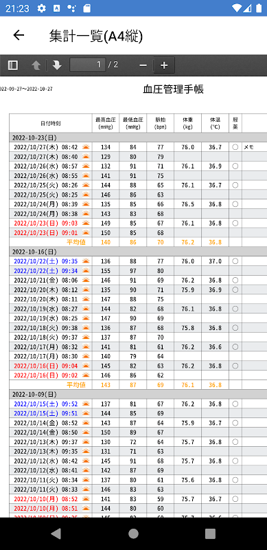 記錄每日血壓、脈搏、體重、體脂百分比、體溫、SpO2,並輸出PDF。