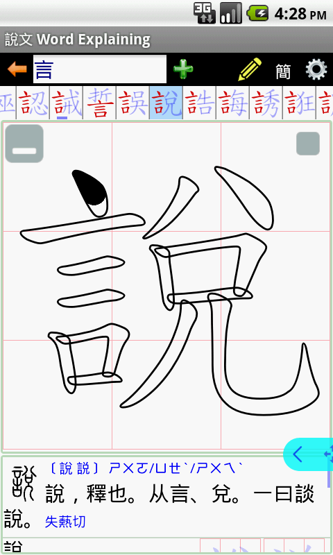 (4)筆劃教學: 可隨時查看「偏旁結構」中每個偏旁的「筆順動畫」,可在放大後進行「筆劃練習」。(Chinese Stroke Teaching)