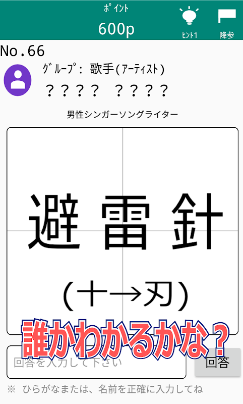 それぞれ出題される暗号を解いて、人物名を回答するゲームです。