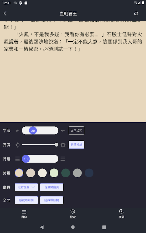· 沉浸閱讀,跟隨你的習慣,文字、背景、翻頁、亮度、全屏、夜間
