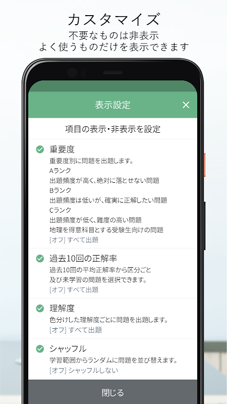 - 隨機播放功能讓您每次以不同的順序回答問題!