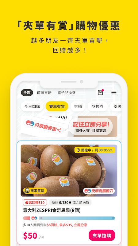 「夾單有賞」購物優惠,越多朋友一齊夾單買嘢,回贈越多,買得多賺得更加多!