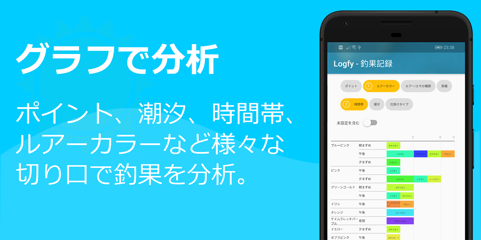 如果添加更多詳細信息,則可以按任何組合(潮汐x誘餌類型x誘餌顏色,魚類x時區等)分析捕魚結果。