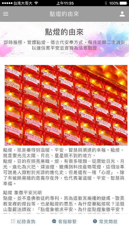 提供宮廟沿革,發展,廟慶資訊,精彩花絮,點燈安太歲服務...等資訊查詢。 *此為宮廟APP平台DEMO展示*