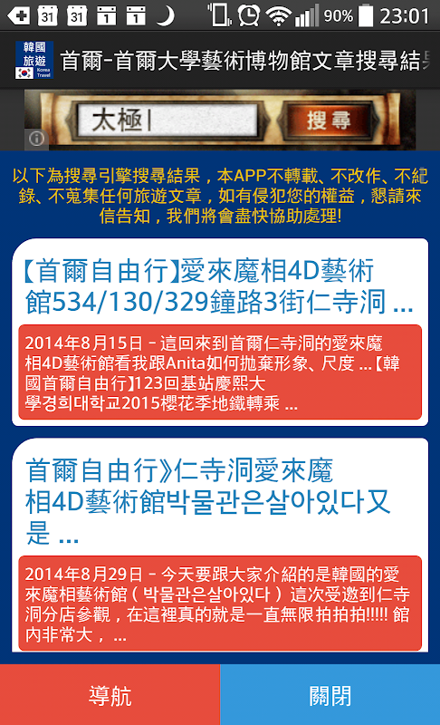 本APP搜尋到的旅遊文章全為搜尋引擎結果,本APP不轉載、不改作、不紀錄、不蒐集任何旅遊文章,如有侵犯您的權益,懇請來信告知,我們將會盡快協助處理!