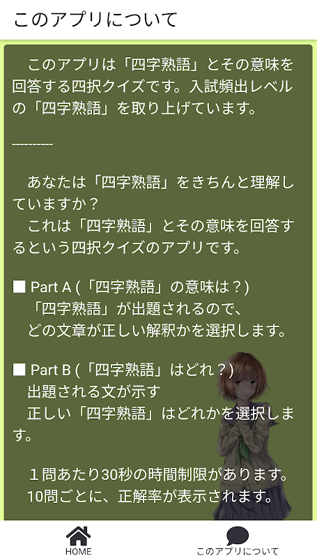 這個應用程序是一個四選擇測驗,回答“Yojijukugo”及其含義。我們正在學習“Yojijukugo”,這是入學考試中經常出現的一個級別。