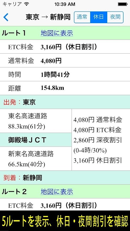 -您可以在多達3條路線的搜索結果中查看ETC常規價格,假日折扣和夜間折扣。